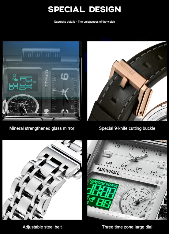 Multiple dials, 24hr and 12 hr, also a digital display.