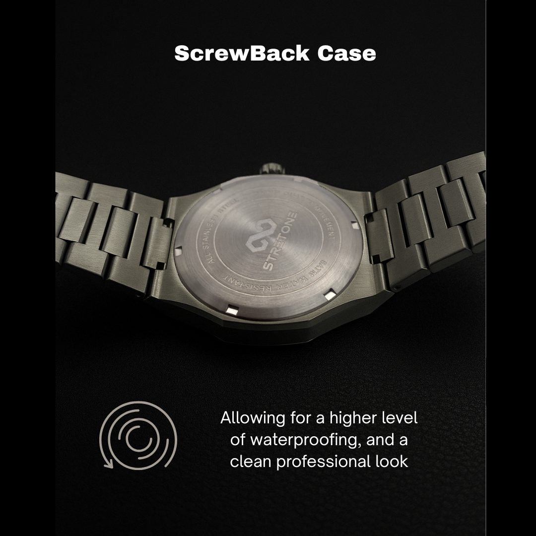 Screw-Back Case– Provides a tighter, more secure seal than Snap-On cases, boosting water resistance and long-term durability. Helps protect the movement from moisture, dust, and impact—ensuring your watch stays reliable in any condition.