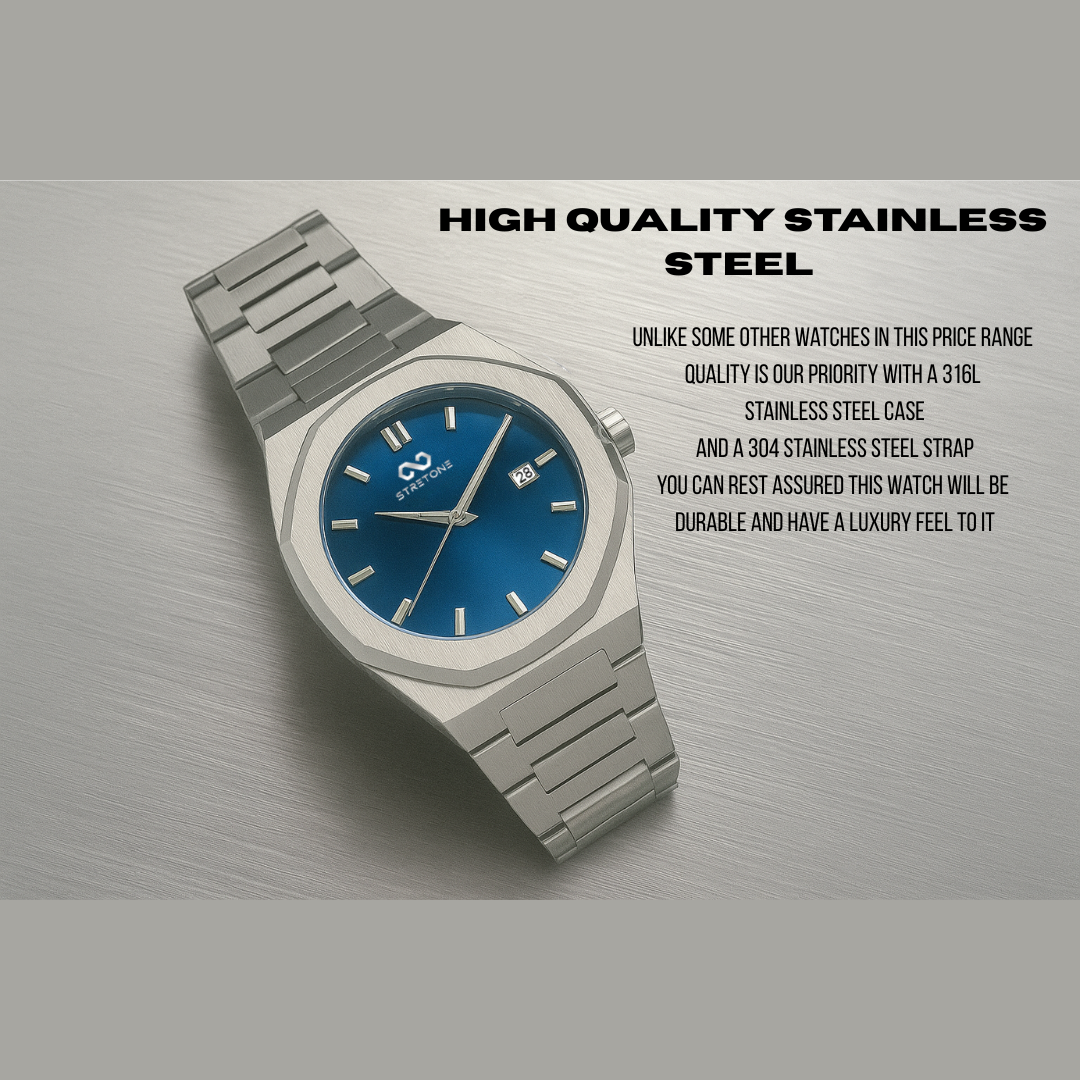 316L, 304 Stainless Steel, Mineral Glass– Premium grades used in high-end watches. They offer superior corrosion resistance, scratch resistance, and long-term durability compared to cheaper stainless steels/materials. These metals won’t fade, rust, or irritate skin, ensuring a stronger, longer-lasting, and more comfortable watch.